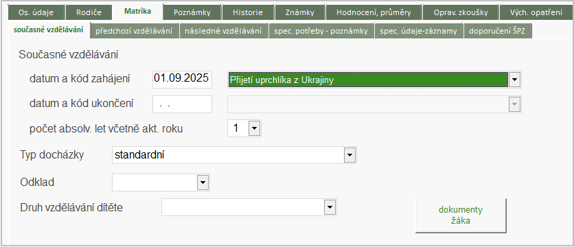 •Do položky Datum a kód zahájení docházky do MŠ/PT/PS byl přidán nový kód U – Přijetí uprchlíka z Ukrajiny.