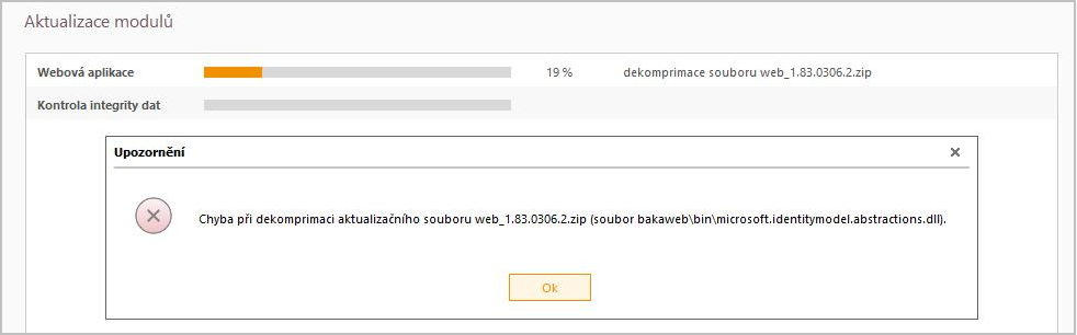•Při spuštění aktualizace může u některých škol docházet k tomu, že v požadovaném časovém limitu nedojde k ukončení aplikace a uvolnění uvedeného souboru k zápisu. V tomto případě pomůže Webovou aplikaci na serveru zastavit, počkat 2 minuty a po provedení aktualizace zase aplikaci spustit.