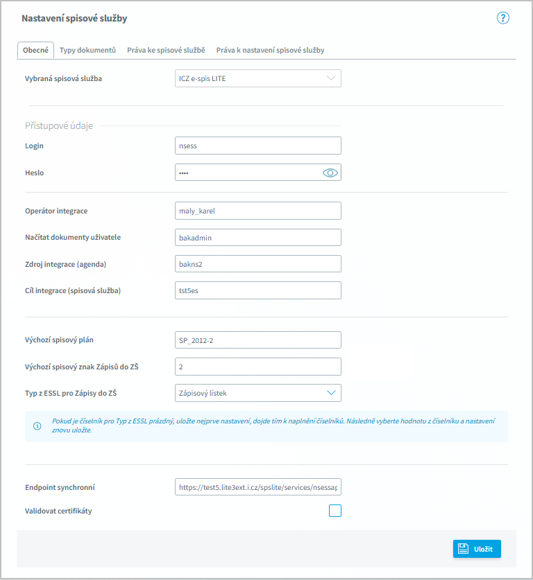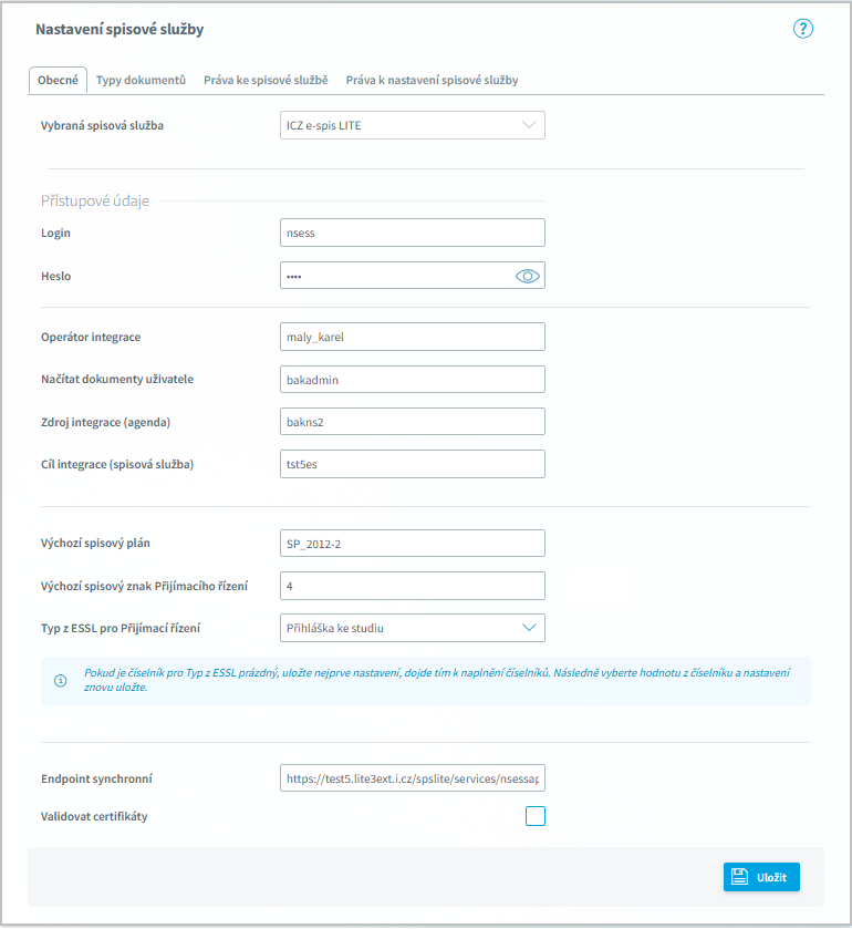 Adresa (URL) služby ve Spisové službě, se kterou bude systém Bakaláři komunikovat v reálném čase. Synchronní komunikace znamená, že systém Bakaláři odešle požadavek a čeká na okamžitou odpověď od Spisové služby.