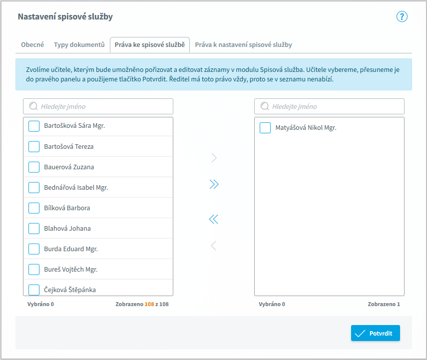 Uživatelé, kteří nejsou uvedeni v pravém sloupci na záložce Práva ke spisové službě a mají přístup do modulu Přijímací řízení, uvidí záložku Spis pouze v režimu prohlížení.