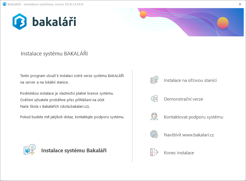Instalace systému Bakaláři se provádí pomocí instalačních souborů a slouží k nainstalování nové "čisté" kompletní instalace, opravě stávající instalace, nebo k instalaci na síťovou stanici.