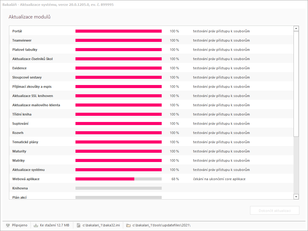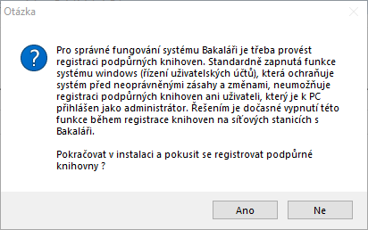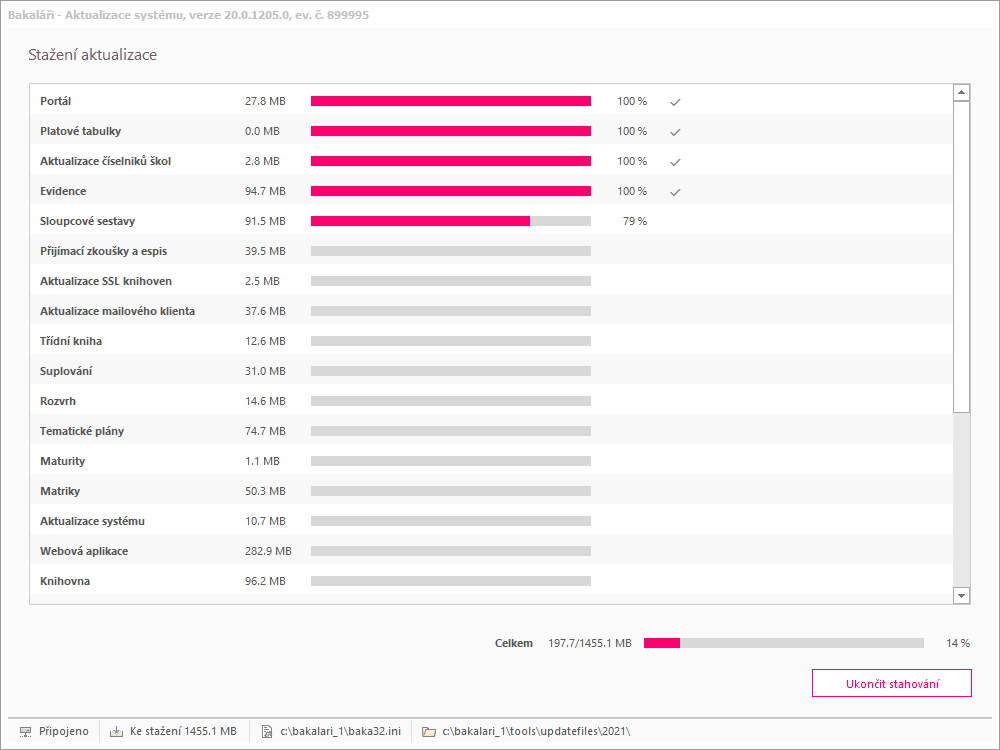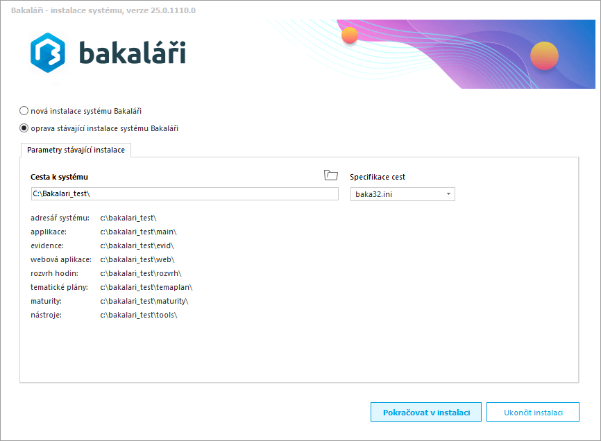 Instalaci provádí správce počítače (člen skupiny Administrators) s plnými právy do adresáře, kam se bude program instalovat. V případě instalace na síťový disk je podporována jak instalace na logickou namapovanou jednotku, tak do adresáře ve tvaru UNC cesty. Před instalací upgrade (přechodu ze starší verze na novou) proveďte kompletní zálohu dat. Vedle toho ale zálohujte též celý adresář s programy i daty, včetně všech podadresářů, např. pomocí komprese do souboru ZIP, a to do jiného adresáře na pevném disku. Tato záloha bude sloužit pro situaci, kdyby došlo k závažné chybě v průběhu instalace (třeba výpadku proudu). V takovém případě by bylo třeba z této zálohy obnovit kompletně původní verzi a provést instalaci znovu. Záloha pouhého adresáře Bakalari nestačí, nebude obsahovat nejdůležitější část dat, která je na SQL serveru, proto je třeba použít našeho archivačního modulu nebo prostředků SQL serveru. Instalace upgrade se provádí do adresáře s původní verzí, v němž jsou obsažena ostrá data. Instalační program konvertuje data do nového formátu. Není tudíž možné dodatečně přenášet data z jiné verze programu do čisté instalace provedené mimo původní adresář (v takovém případě by program narážel na chybějící položky s nově evidovanými údaji apod.). Pokud byste přesto chtěli Bakaláře z nějakého důvodu instalovat do nového adresáře, po přenesení dat ze starší verze je třeba znovu spustit instalaci. Před vlastní instalací zajistěte, aby s žádným z modulů Bakalářů nikdo nepracoval. Doporučujeme instalaci provádět např. v odpoledních hodinách. Pokud je to možné zakažte dočasně systémově přístup uživatelům k adresáři Bakalari. V případě problémů s instalací zejména na Novelovském nebo Linuxovém serveru doporučujeme možnost překopírovat celý adresář Bakalari na lokální disk, provést instalaci upgrade zde a pak zase vrátit celé na původní místo (jen je třeba nastavit cesty v souboru baka32.ini). O všech novinkách informujeme na našich stránkách. Pokud máte instalaci na síťovém serveru, je třeba nejprve instalovat celý program kompletní instalací do původního adresáře a dále instalovat program na klientských počítačích pomocí instalace na síťovou stanici, která vytvoří ikony zástupců programů a zaregistruje podpůrné knihovny do systému Windows (je třeba mít pro instalaci administrátorská práva k systému). Při instalaci dalšího upgrade už není třeba lokální instalaci na všech počítačích opakovat. |