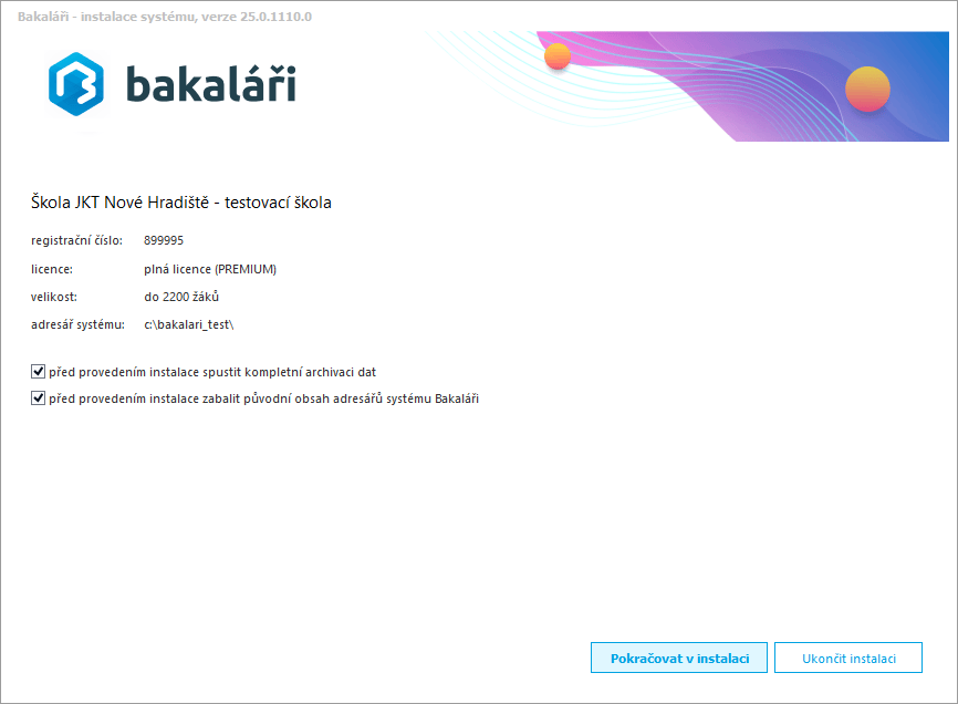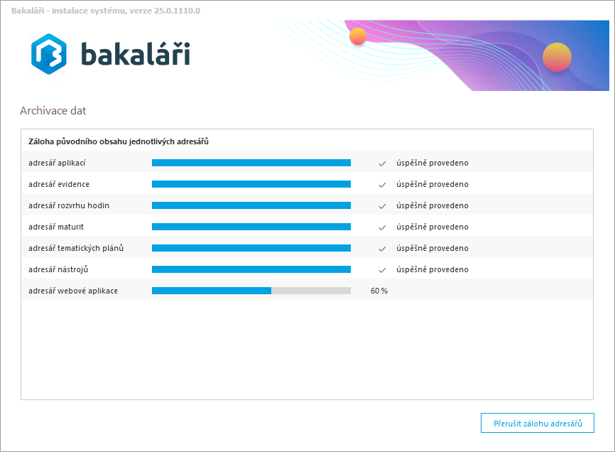 Jsme dotázání, zda před spuštěním provést kompletní archivaci dat (rozhodně doporučujeme). Můžeme i zabalit původní obsah adresářů systému Bakaláři.