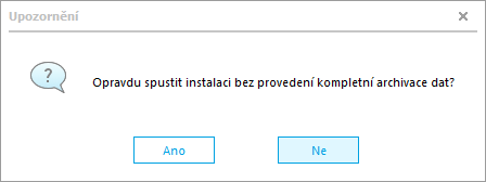 Nastane-li při instalaci havárie, bude třeba obnovit kompletně starou verzi a provést instalaci znovu. Zálohujte proto před instalací celý adresář s programy včetně všech podadresářů do pomocného adresáře na pevném disku. Nezapomeňte zálohovat také data (pomocí modulu Archivace nebo zálohováním SQL serveru). Připomínáme, že tato záloha slouží pouze pro případ, kdyby se při instalaci vyskytly problémy a bylo nutno nahrát zpět starou verzi. V žádném případě nelze jakákoli data ze zálohy přehrávat do nainstalované nové verze. V nové verzi programu je totiž jiná struktura mnohých souborů. Instalační program převádí data ze staré verze do tvaru nutného pro verzi novou.