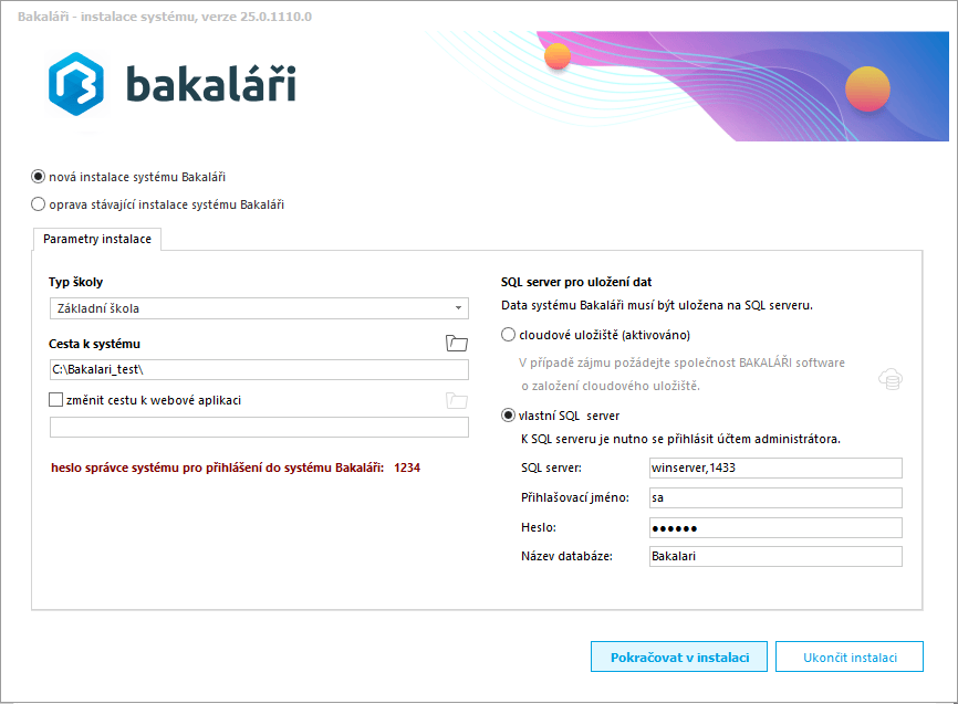 Data systému musí být uložena na SQL serveru, vyplníme přístupové údaje k SQL serveru a název databáze.