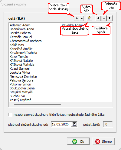 Při tvorbě takového záznamu musíme zadat, kteří žáci a od kdy do kdy navštěvovali vybranou třídu, do jakých skupin byli přiřazeni (případně je třeba vybrat žáky po částech).