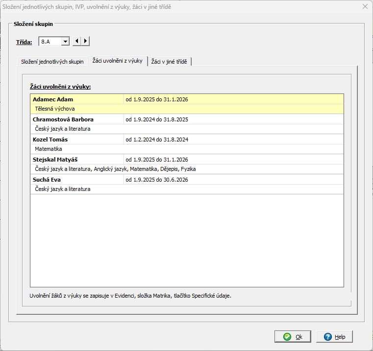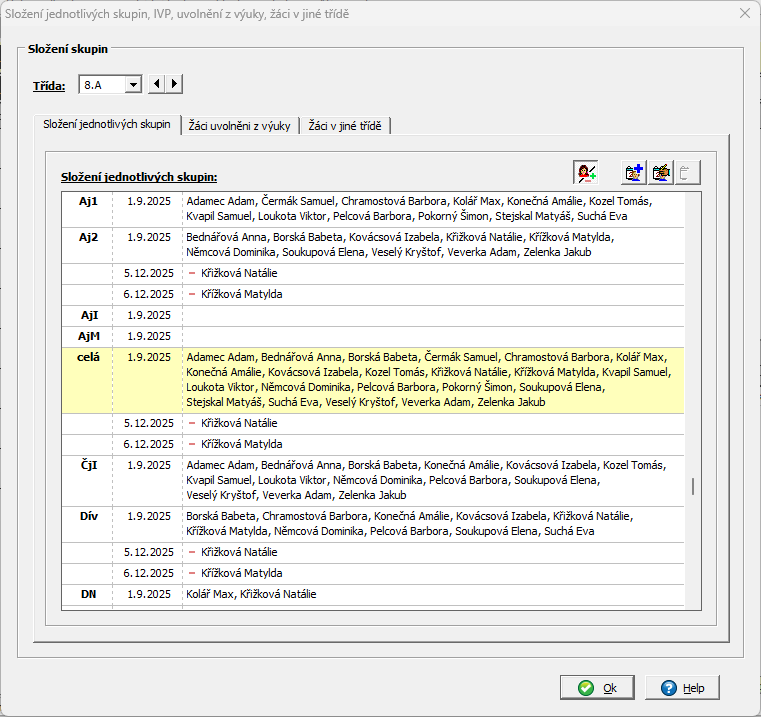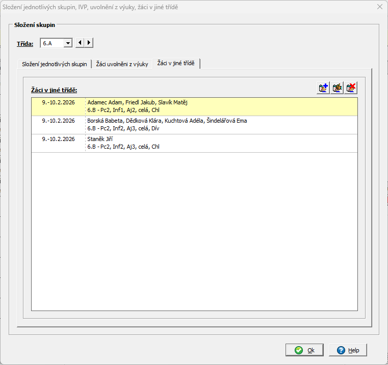 << Klikni pro zobrazení obsahu >> Navigace: Třídní kniha > Jednotlivé části programu > Práce s daty > Obsazení jednotlivých skupin, IVP, uvolnění z výuky, žáci v jiné třídě |