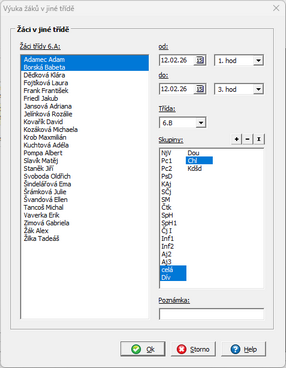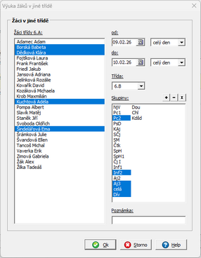 Můžeme také zadat skutečnost, že někteří žáci po nějakou dobu navštěvovali jinou třídu, než je jejich kmenová (např. během lyžařského výcviku zůstávají ve škole a učí se s jinou třídou - Jak na lyžařský výcvik?).