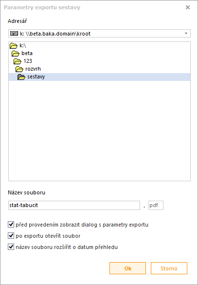 V parametrech výstupu můžeme nastavit možnosti tisku a exportu sestavy.