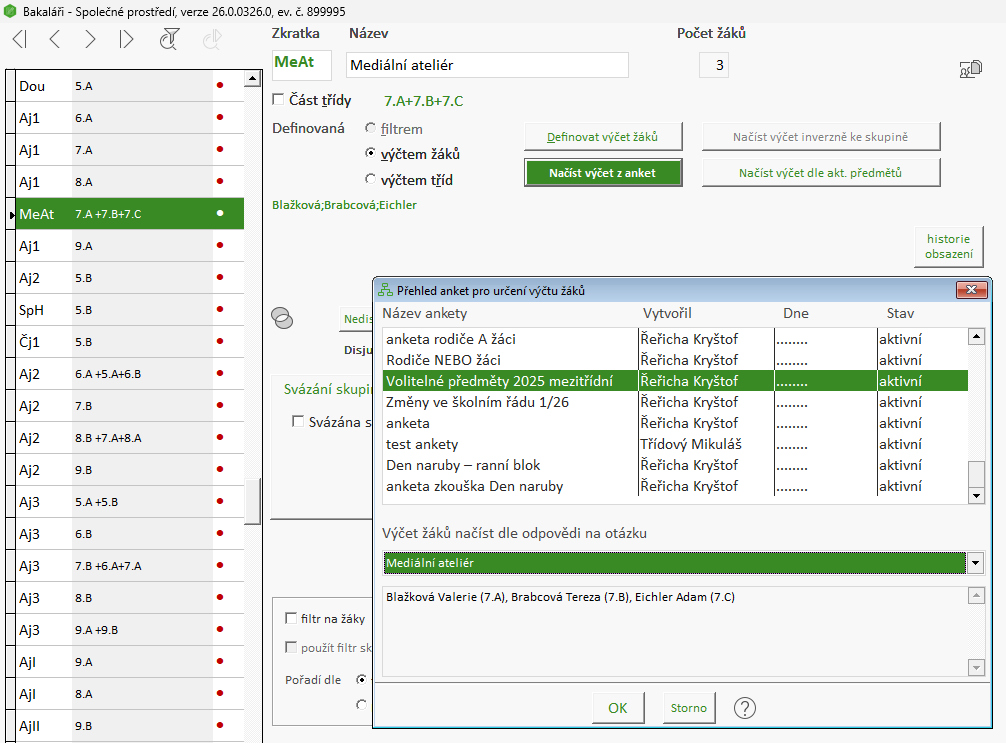 Vybereme odpovídající anketu a otázku, jejíž výběr se má přenést do výčtu žáků ve skupině. |
