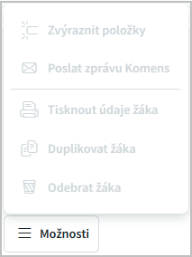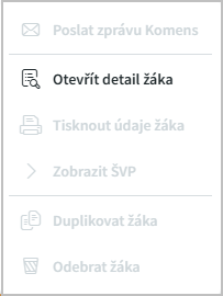 je nabídka dalších akcí (v současné době je aktivní pouze Otevřít detail žáka, ostatní funkcionality připravujeme).