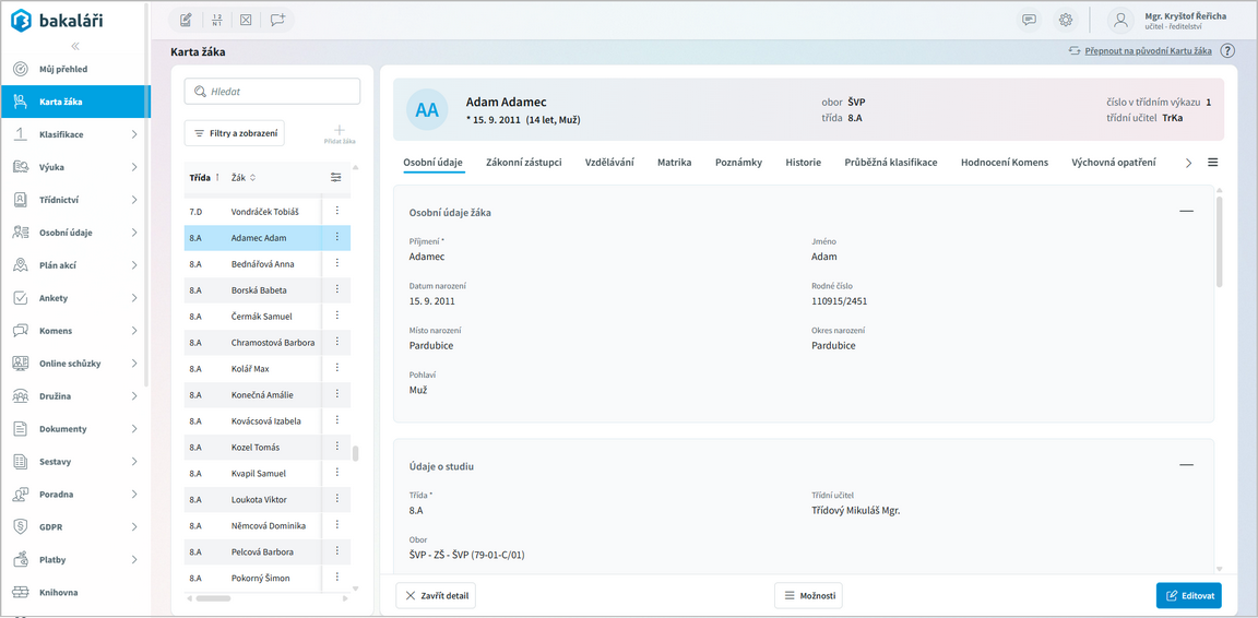 Detail žáka zobrazíme kliknutím na libovolné místo v řádku vybraného žáka nebo pomocí ikony