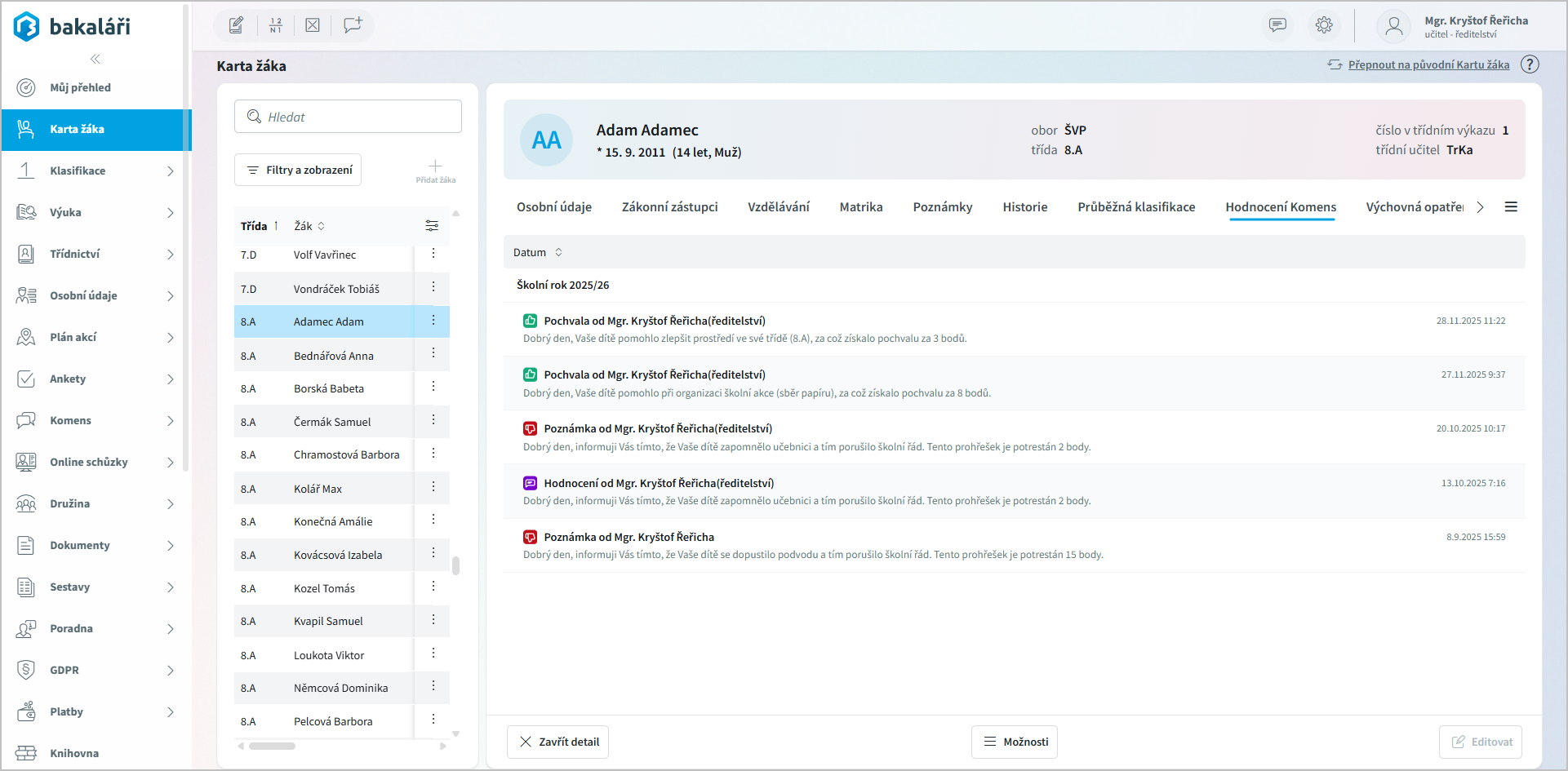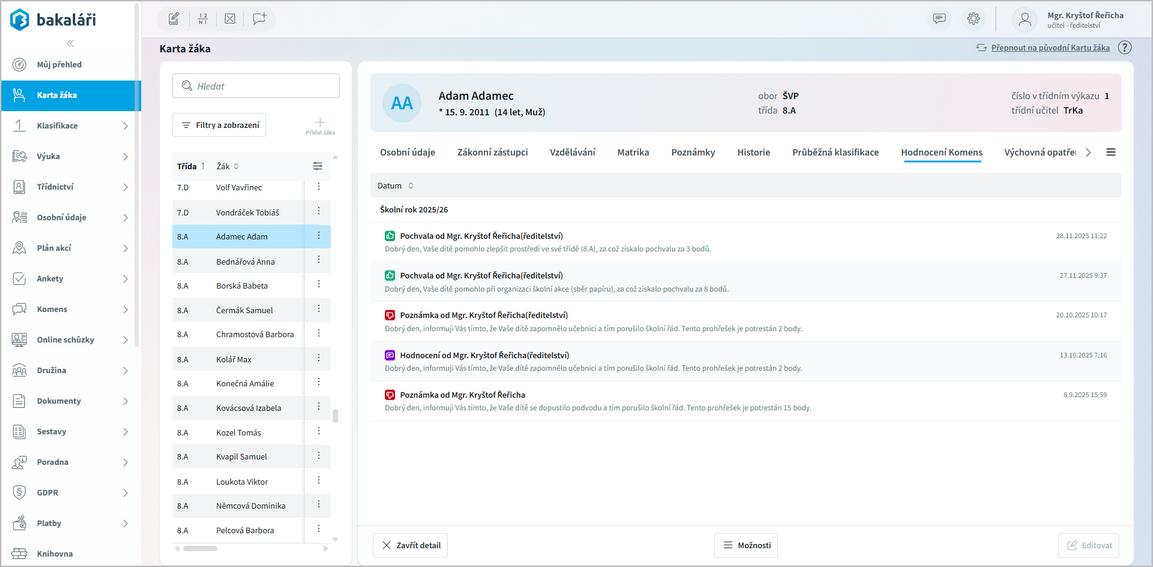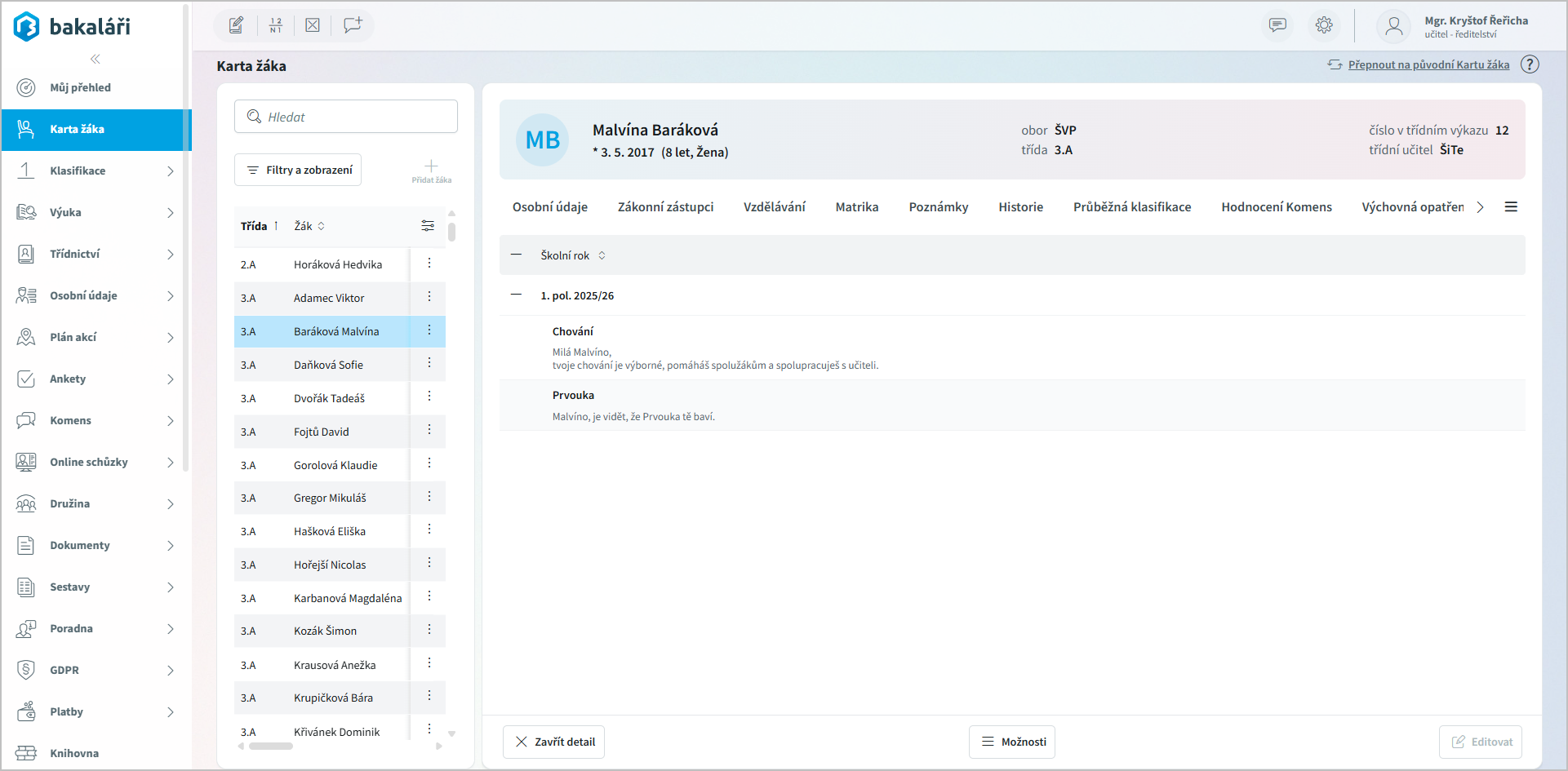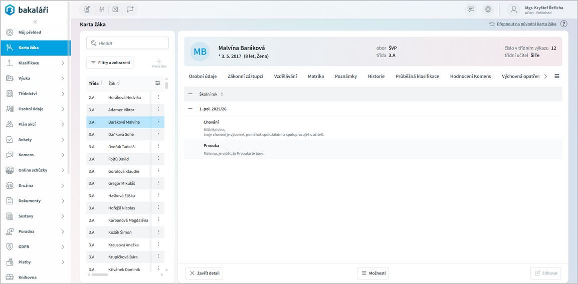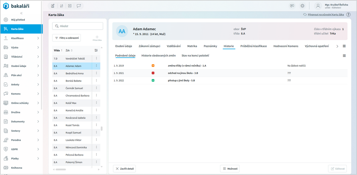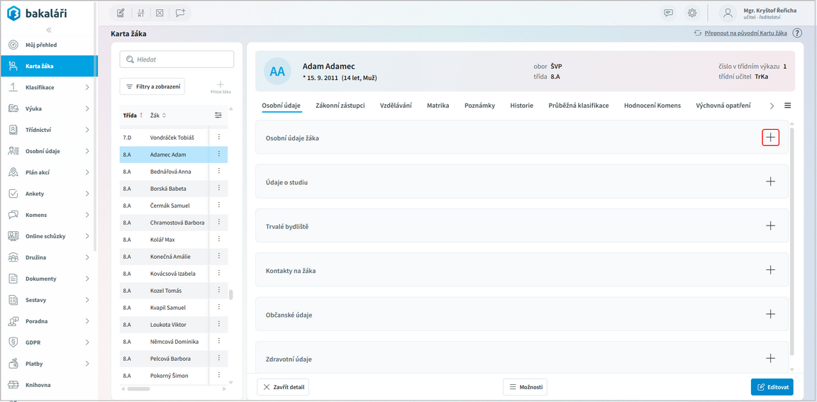 na konci každého řádku (Otevřít detail žáka).