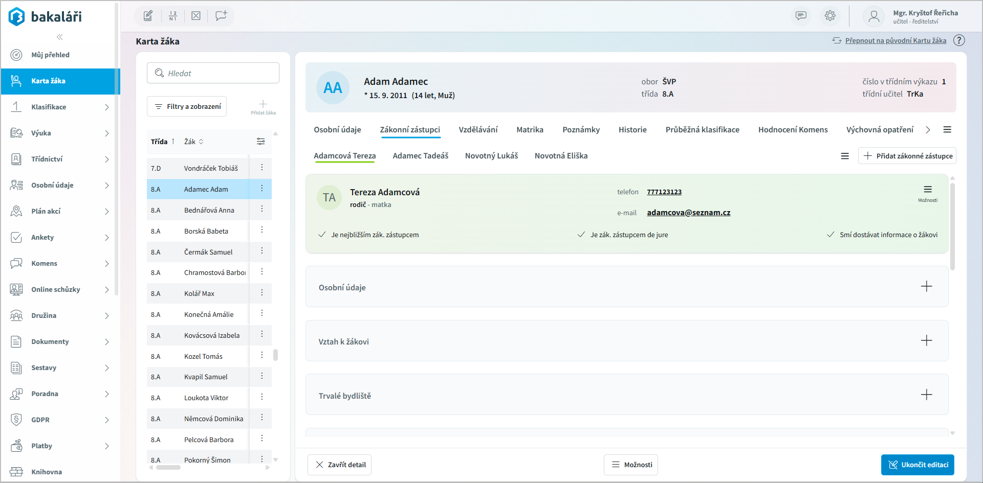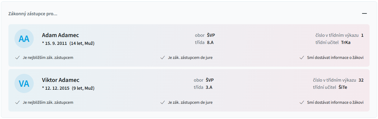 Na této záložce vidíme podzáložky se všemi zadanými zákonnými zástupci.