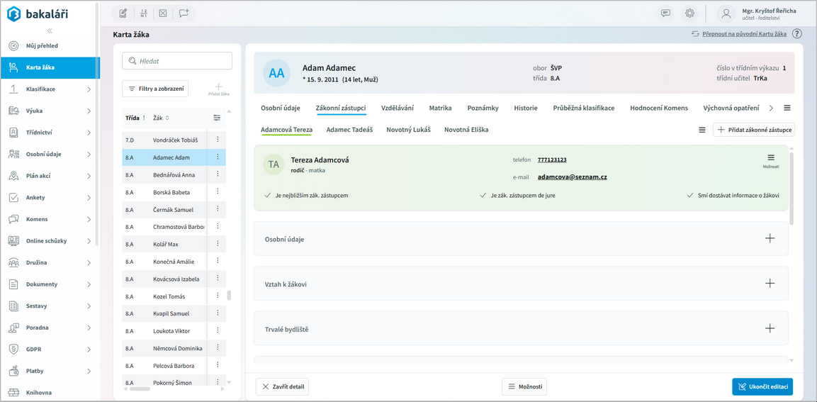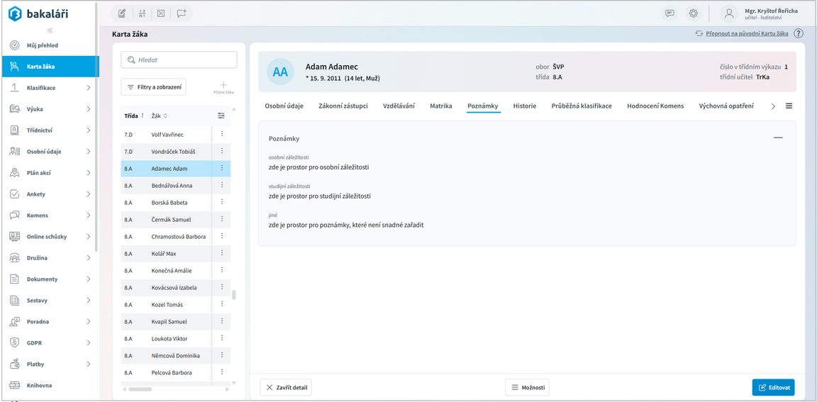 Oprávnění učitelé mohou v nabídce Karta žáka vidět seznam žáků včetně základních údajů na jednotlivých záložkách
