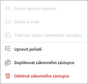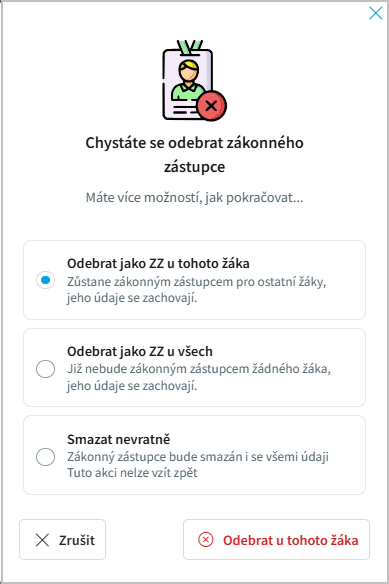 Jednotlivé zákonné zástupce odebíráme přímo v detailu zákonného zástupce pomocí ikony