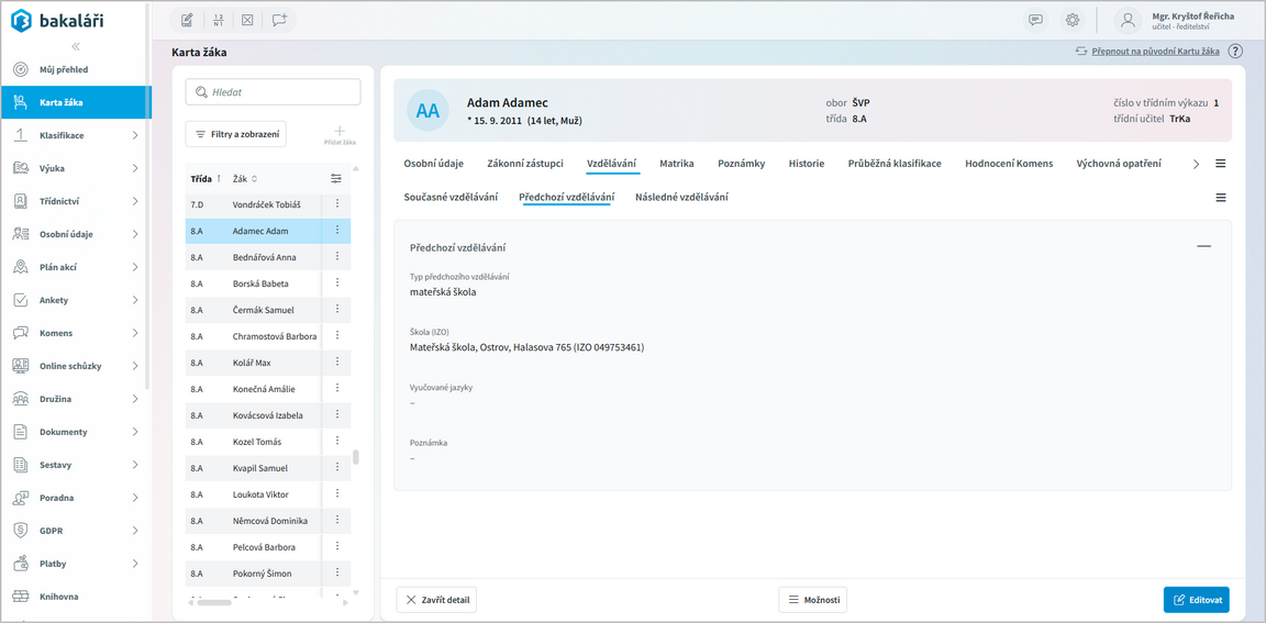 Můžeme se vrátit k původní kartě žáka (tlačítko Přepnout na původní kartu žáka).