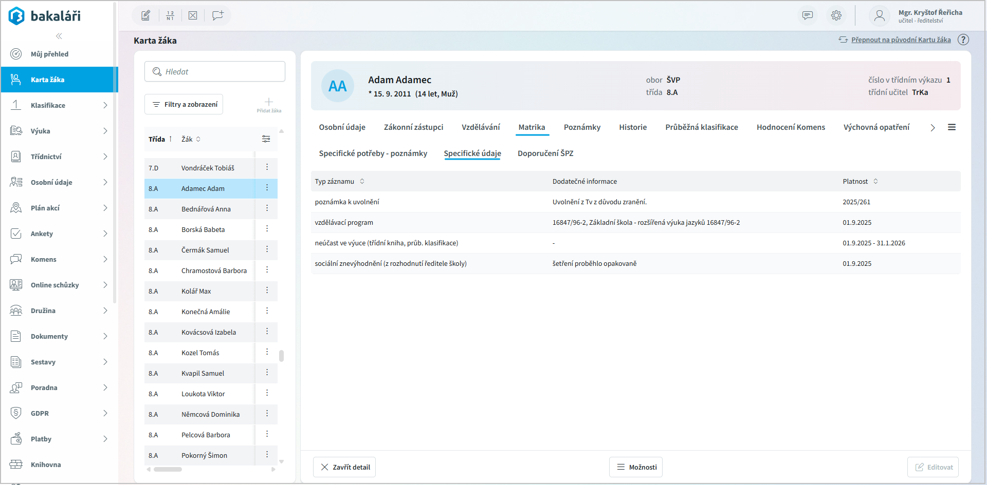 Specifické údaje - na této záložce editaci teprve připravujeme (pro editaci je nutné použít Kartu žáka v desktopové Evidenci)