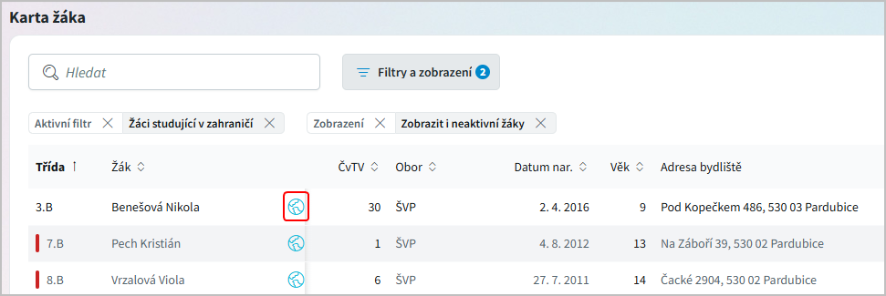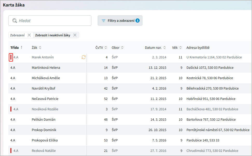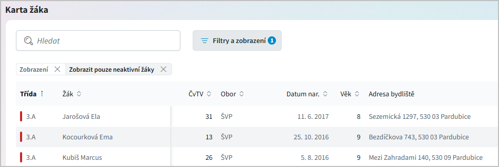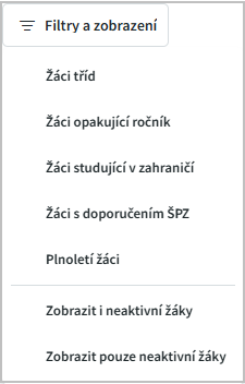 Zobrazit i neaktivní žáky - budou zobrazeni žáci aktivní i žáci s příznakem zrušení.
