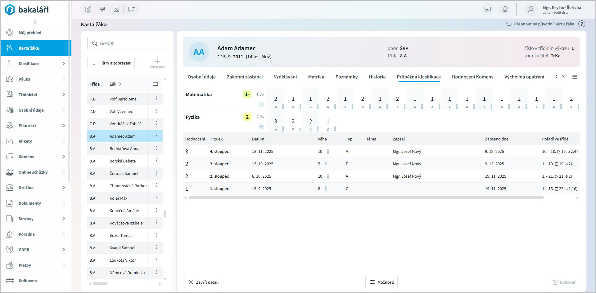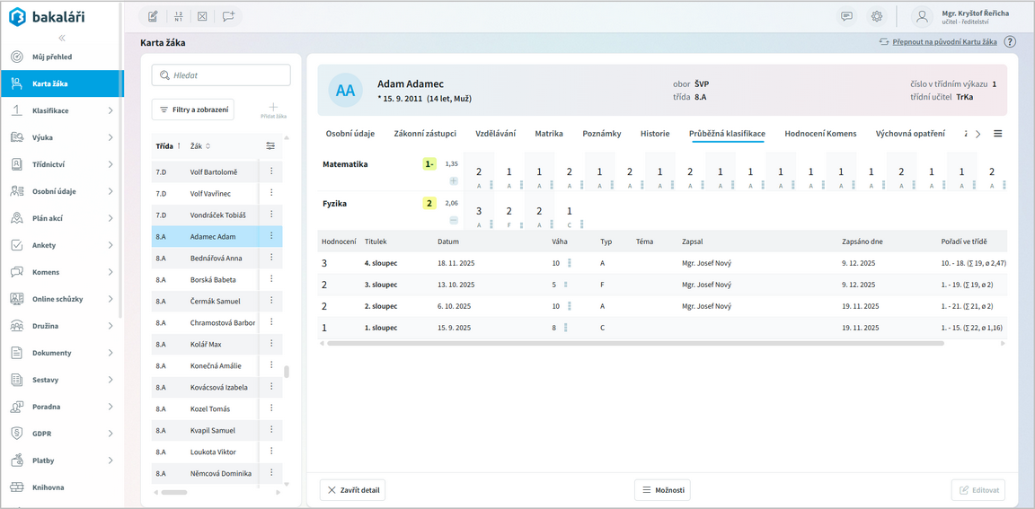 Na záložce Průběžná klasifikace vidíme zadanou průběžnou klasifikaci včetně čtvrtletní klasifikace. U jednotlivých známek je možné vidět jejich váhu, kdo a kdy ji zadal a další informace.