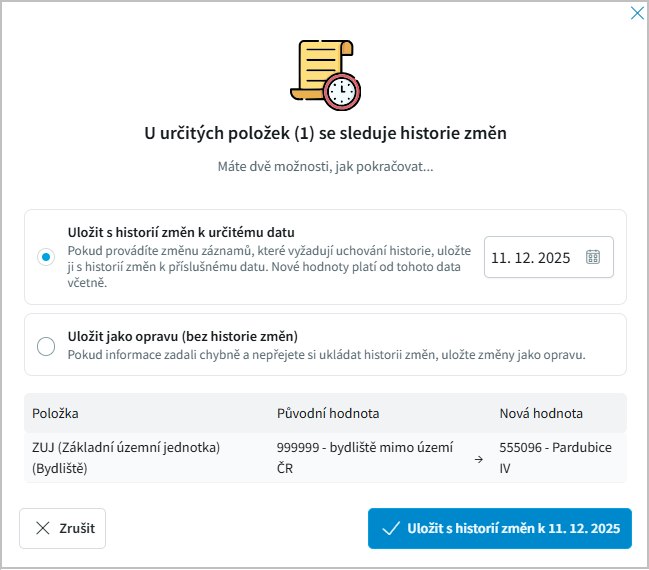 ukazuje položky, u kterých je sledována historie změn. Po provedení změny jsme dotázáni, zda změnu uložit do historie a k jakému datu.