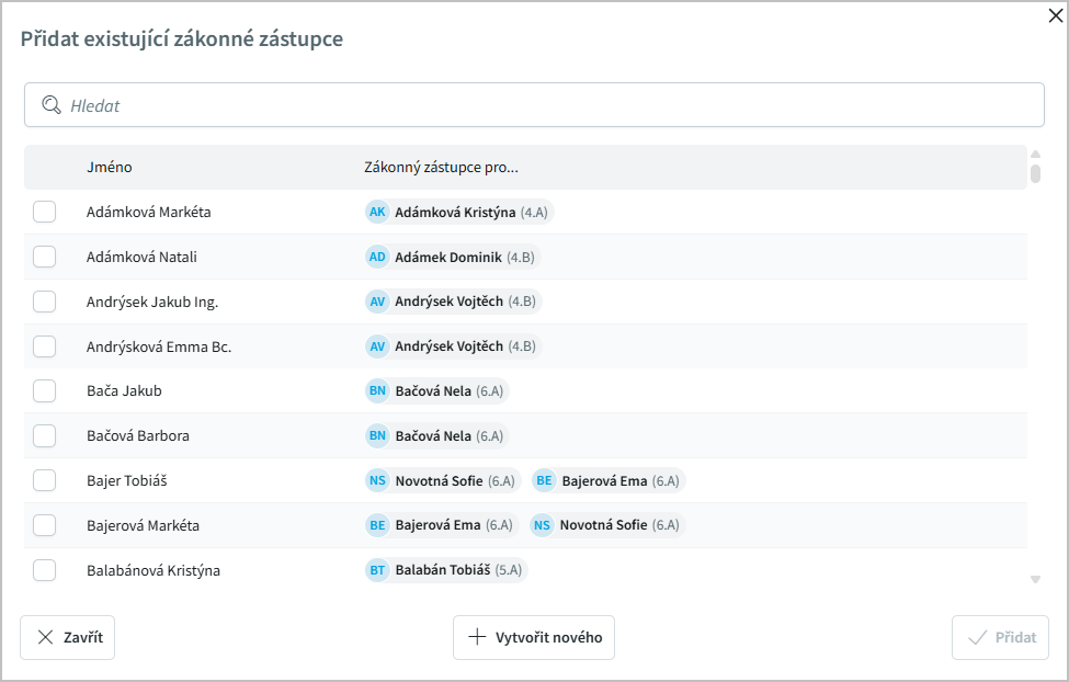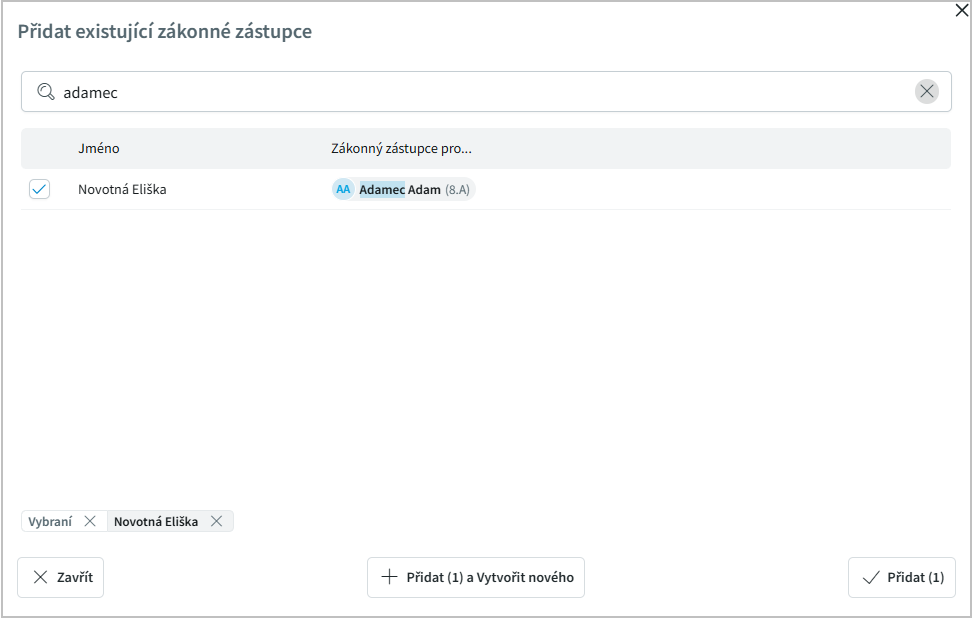 Chceme-li Přidat zákonné zástupce, můžeme vybírat z existujících rodičů (v případě sourozenců) nebo přidat nového.