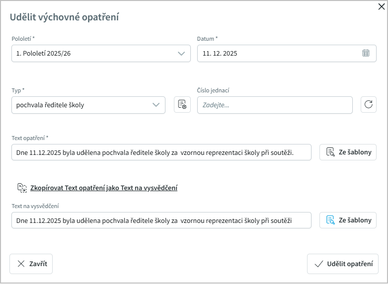 Výchovné opatření udělujeme za konkrétní pololetí, vyplníme datum udělení.