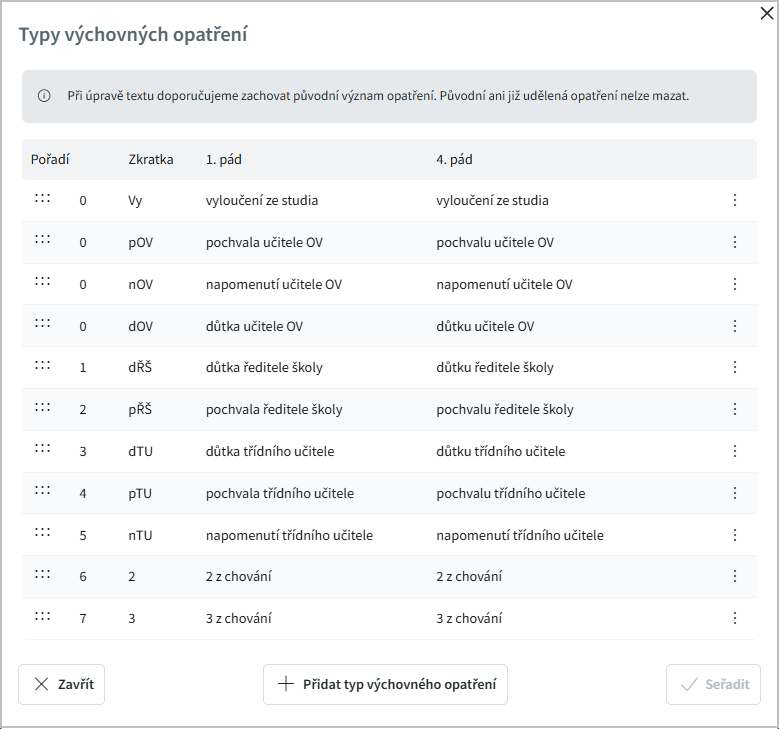 otevřeme nabídku pro editaci stávajících výchovných opatření: