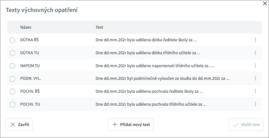 Text na vysvědčení - text opatření můžeme kopírovat na vysvědčení. I tento text můžeme editovat nebo vybrat z číselníku.