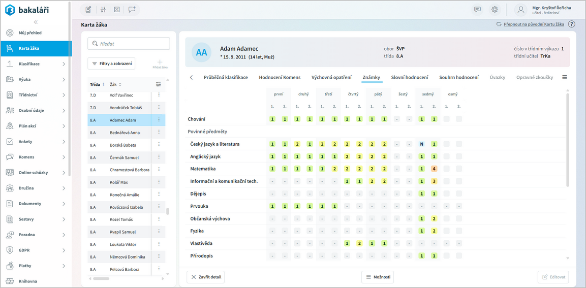 V hlavičce Karty žáka vidíme základní údaje o třídě, datu narození, třídním učiteli a číslu v třídním výkazu.