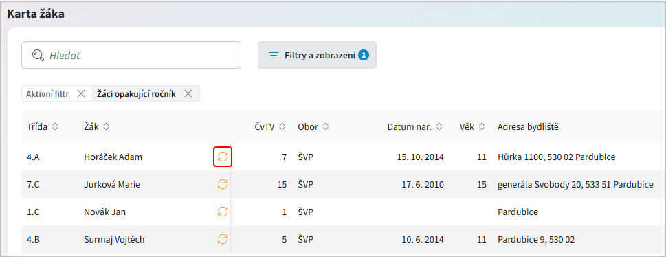 Žáci opakující ročník - budou vyfiltrováni žáci, kteří mají na záložce Historie zadáno opakování ročníku ať už z prospěchových nebo zdravotních důvodů.