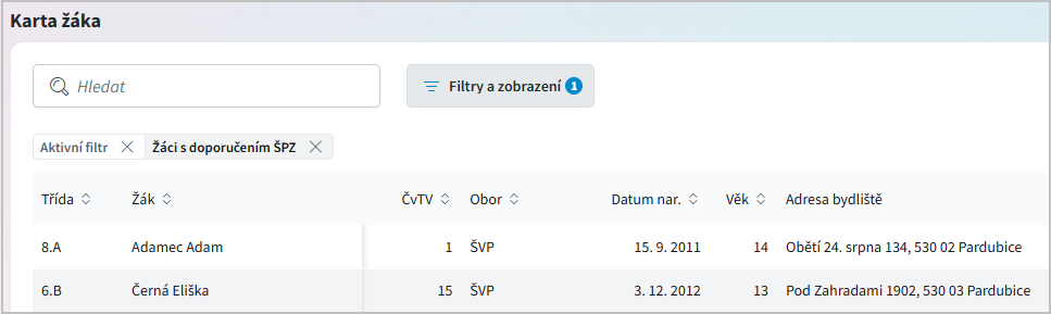 Žáci s doporučením ŠPZ - filtrujeme žáky s aktivním doporučením školského poradenského zařízení.