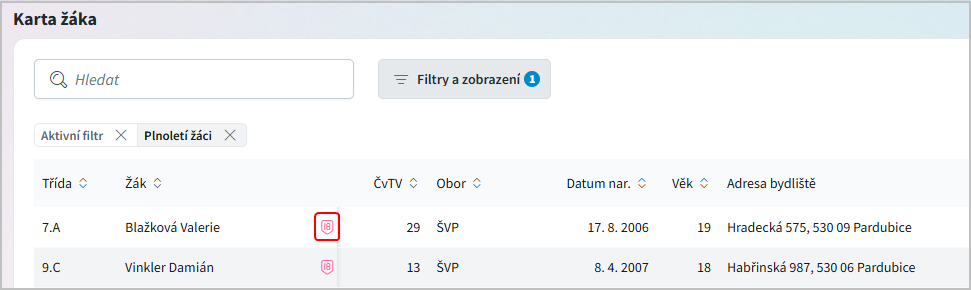 Plnoletí žáci - filtrujeme pouze žáky, kteří dosáhli plnoletosti.