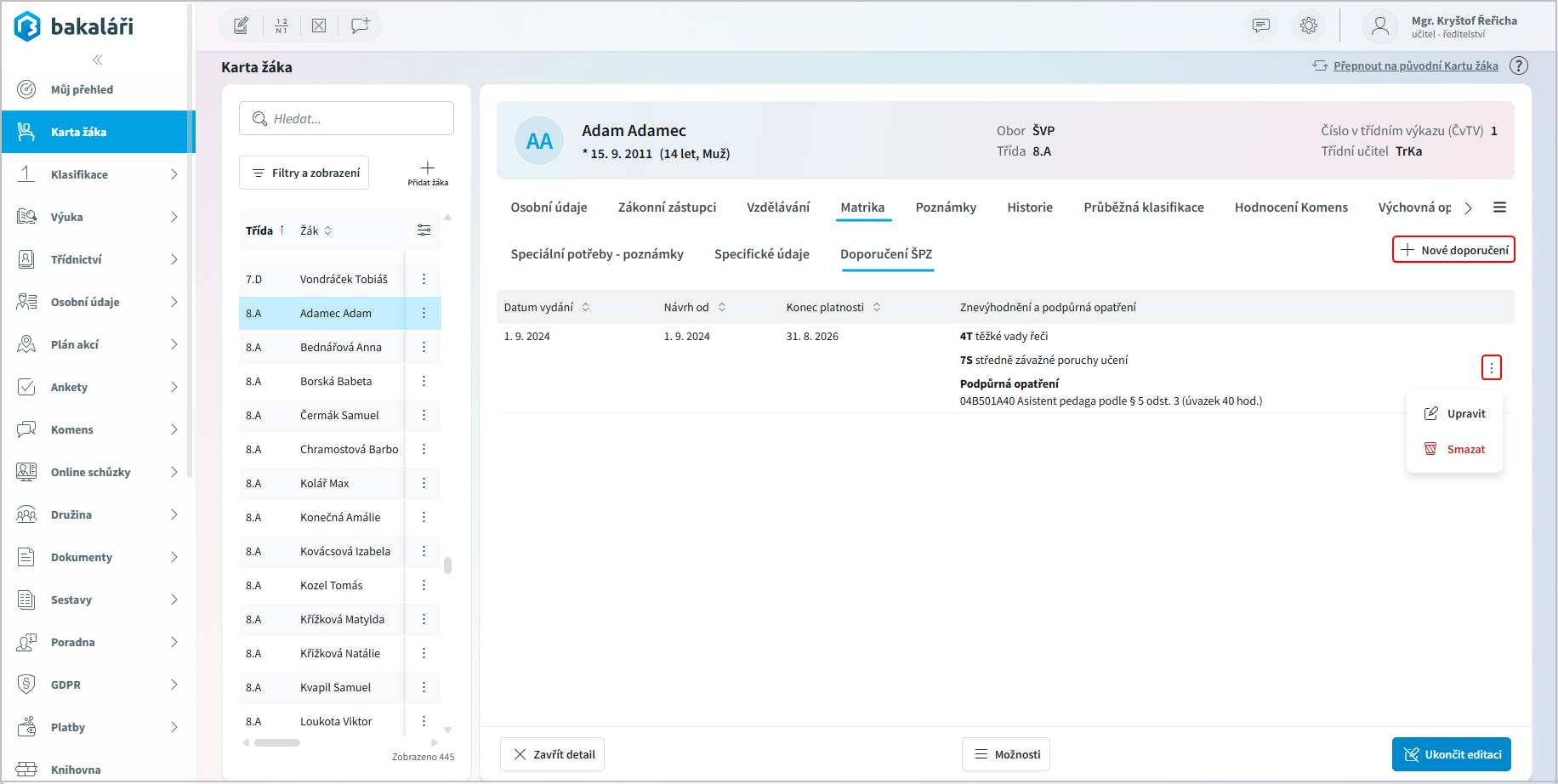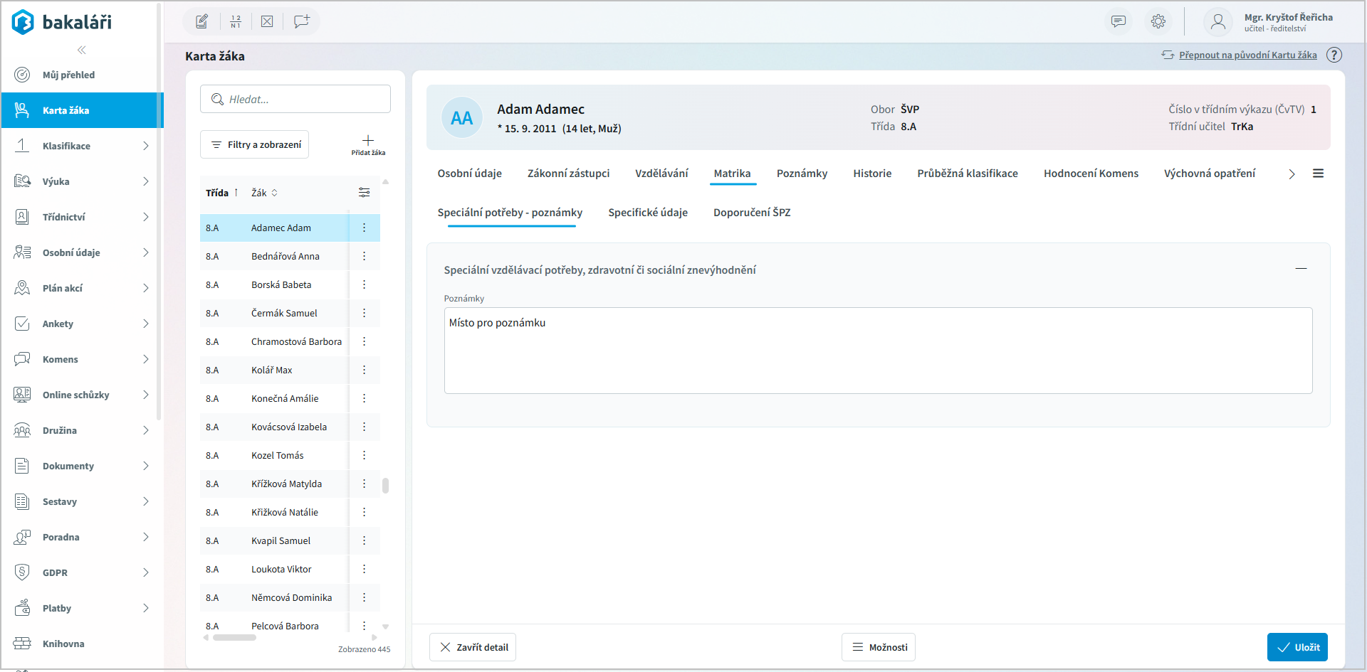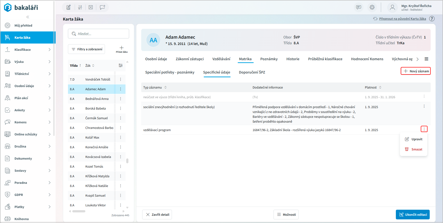 << Klikni pro zobrazení obsahu >> Navigace: Webová aplikace > Karta žáka - nová > Matrika |