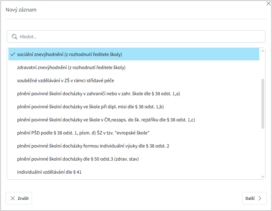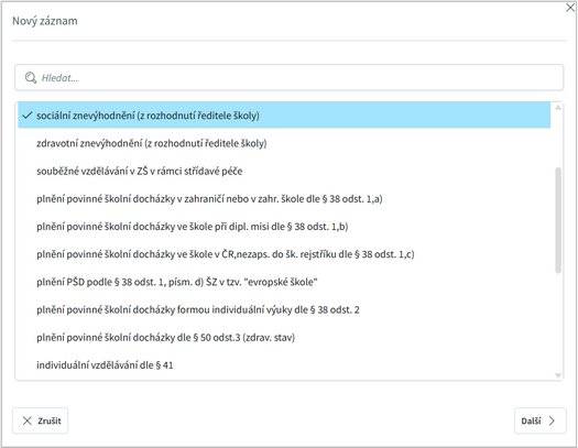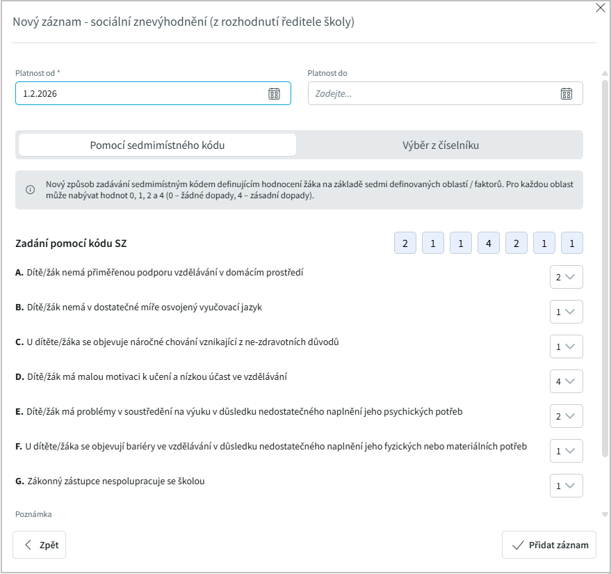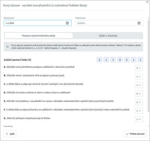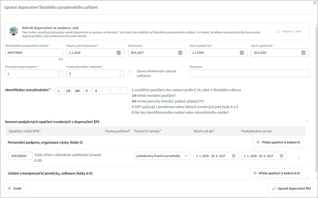 nebo zadat ručně. Pečlivě vyplníme všechny informace z doporučení, zadáme i podpůrná opatření na základě NFN kódů, ať už se jedná o personální podporu nebo učební pomůcky.