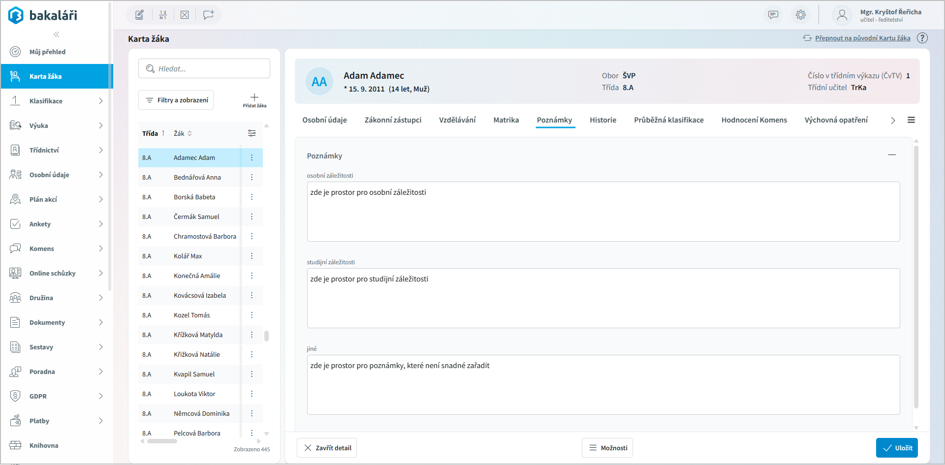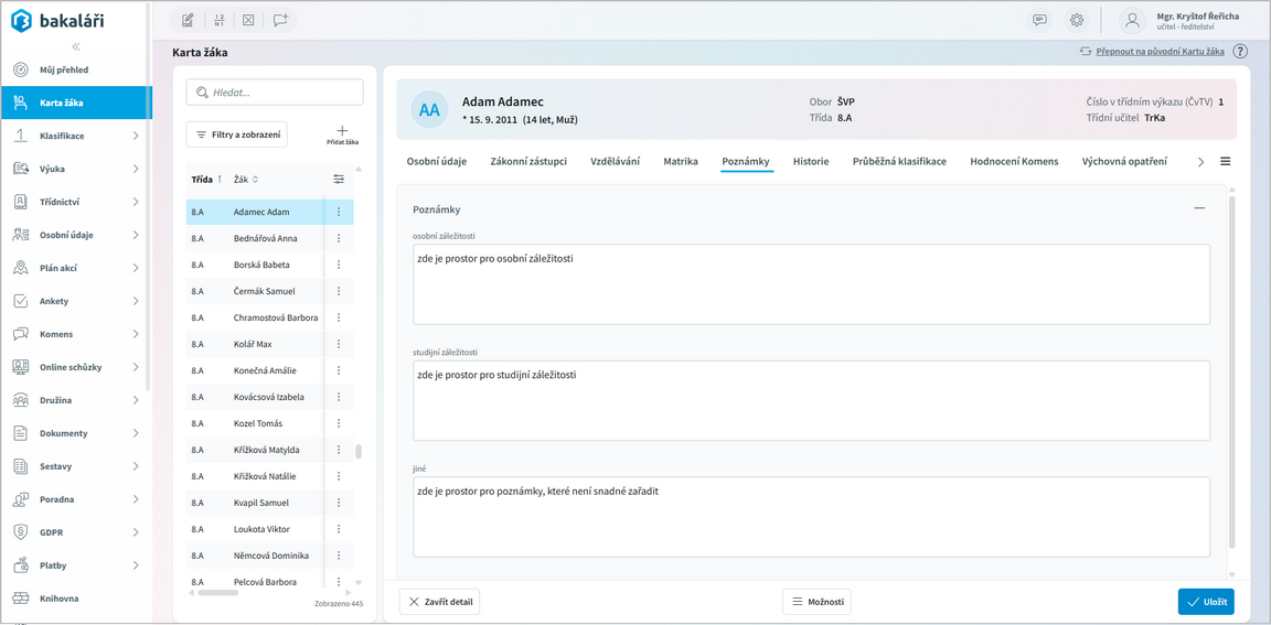 << Klikni pro zobrazení obsahu >> Navigace: Webová aplikace > Karta žáka - nová > Poznámky |