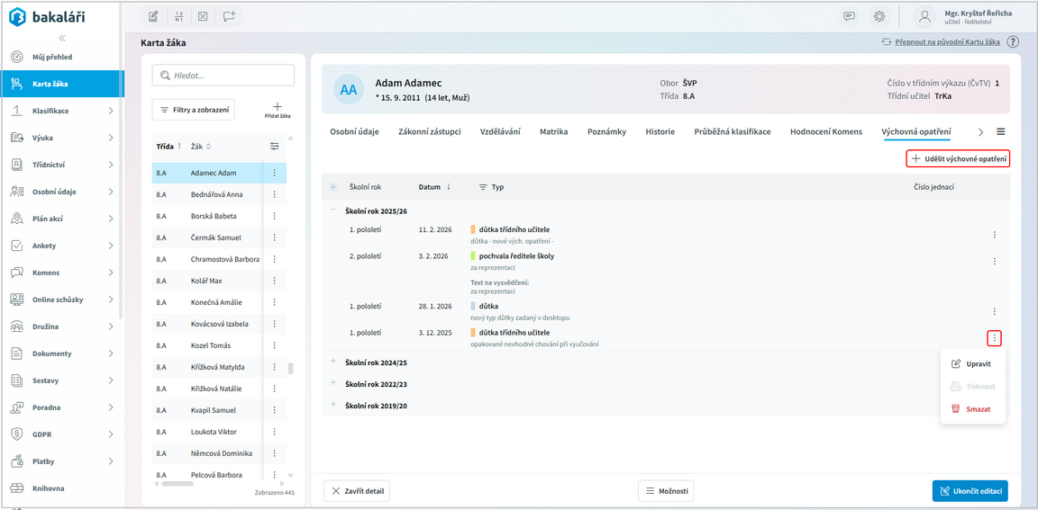 << Klikni pro zobrazení obsahu >> Navigace: Webová aplikace > Karta žáka - nová > Výchovná opatření |