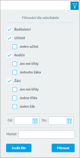 Můžeme si zobrazit zprávy odeslané všemi uživateli nebo jen některou skupinou, omezit zobrazení jen na časový úsek, případně na text ve zprávě.