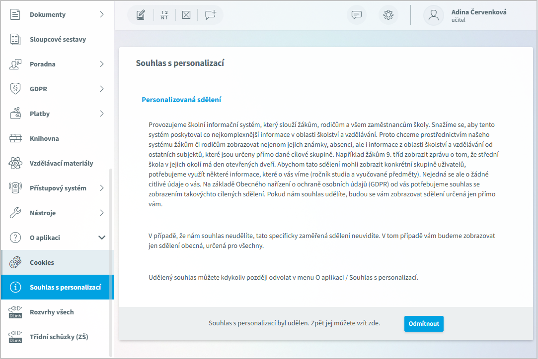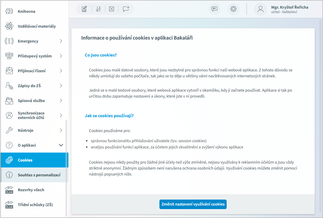 Na této stránce najdeme informace o tom, jak Bakaláři zpracovávají informace o přihlášeném uživateli.