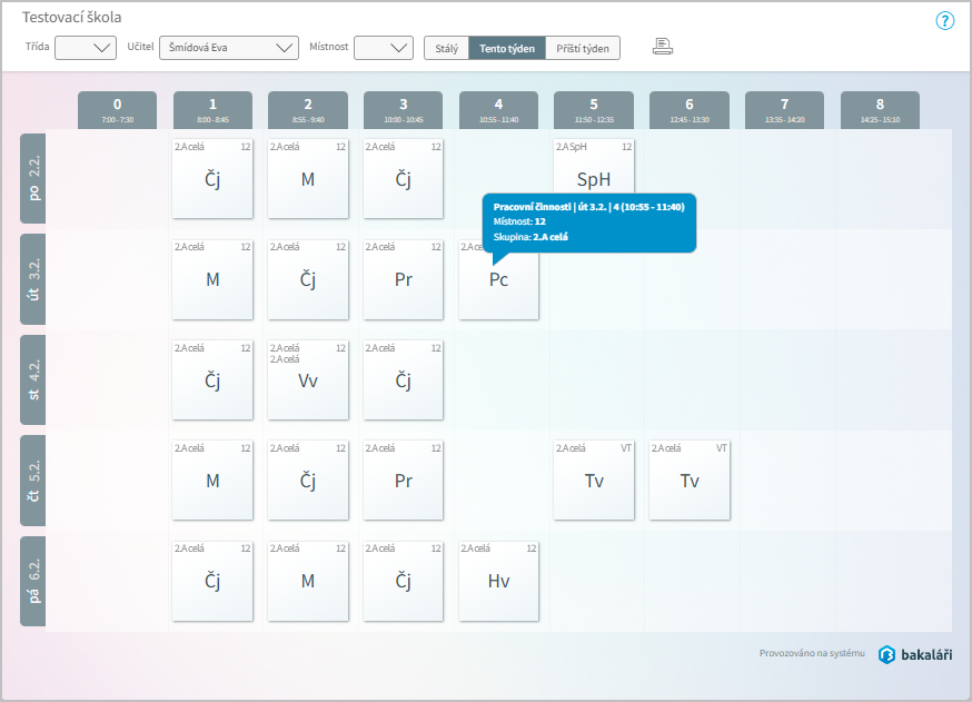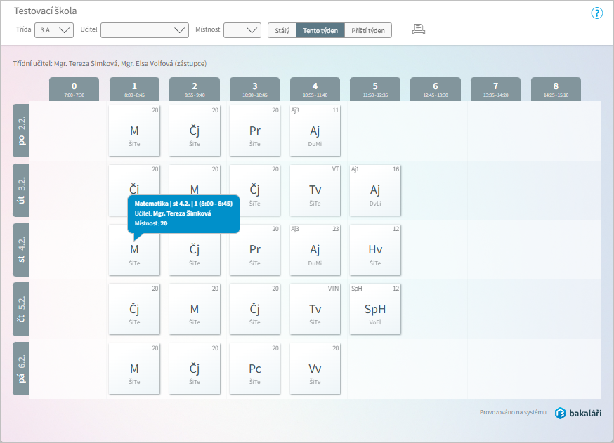 Tip: v rozvrhu třídy můžeme vidět třídního učitele a zastupujícího třídního učitele vybrané třídy.