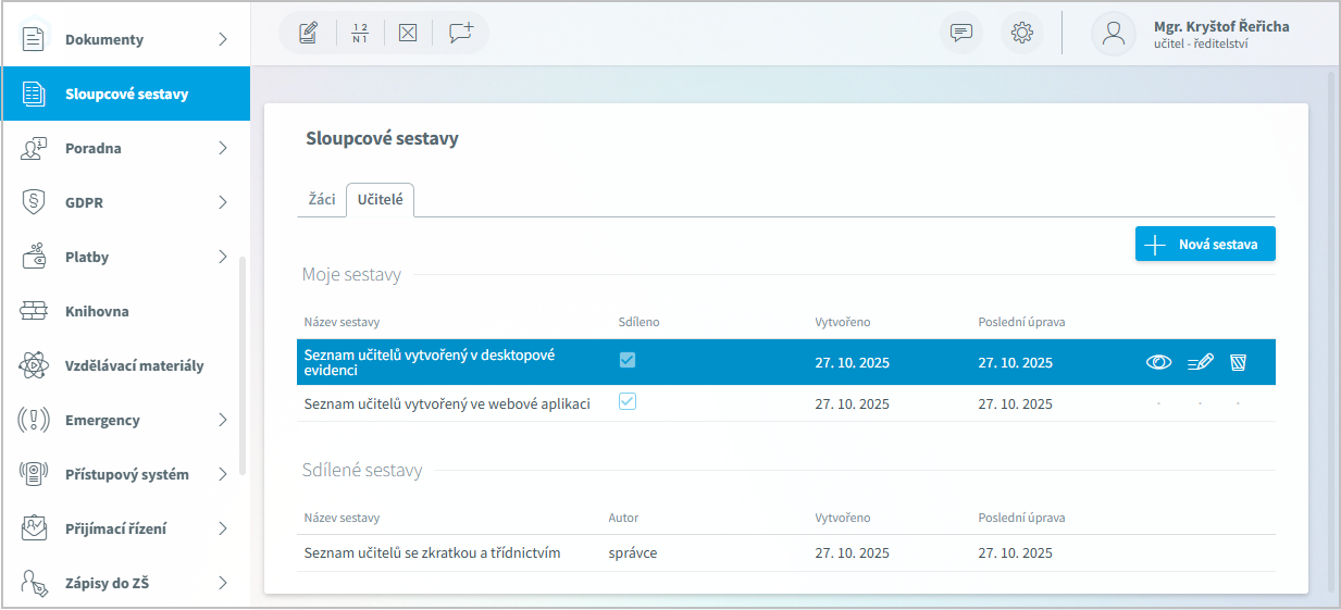V části Sdílené sestavy máme zobrazeny všechny sestavy ostatních učitelů, které poskytli ke sdílení.