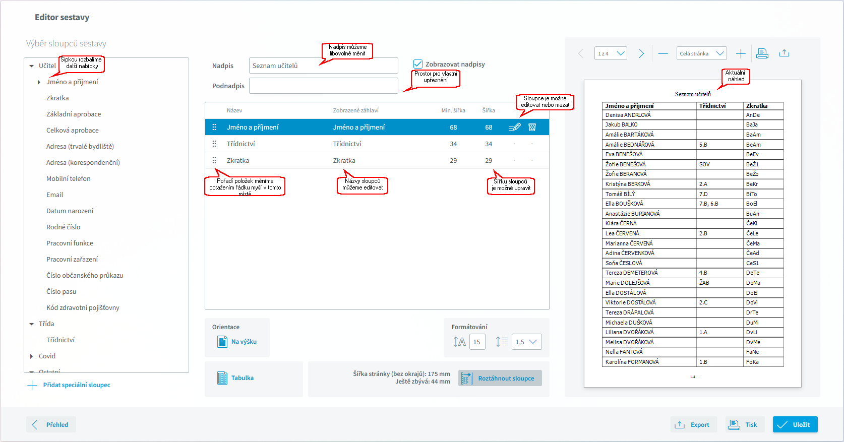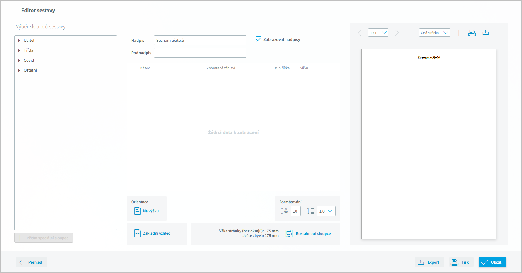V záhlaví sestavy můžeme zobrazit doplňující informace a zvolit, zda každou třídu uvádět na nové stránce.
