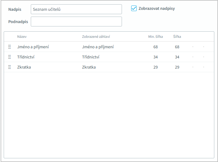 Popisy ve sloupci Zobrazené záhlaví a hodnoty ve sloupci Šířka můžeme měnit prostřednictvím ikony