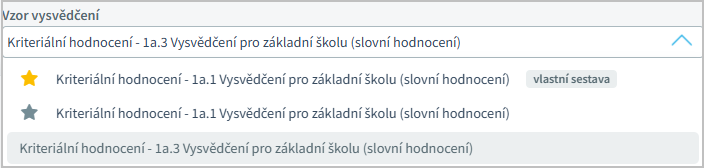 Vzor vysvědčení - vidíme jak sestavy vytvořené Bakaláři, tak vlastní vytvořené sestavy