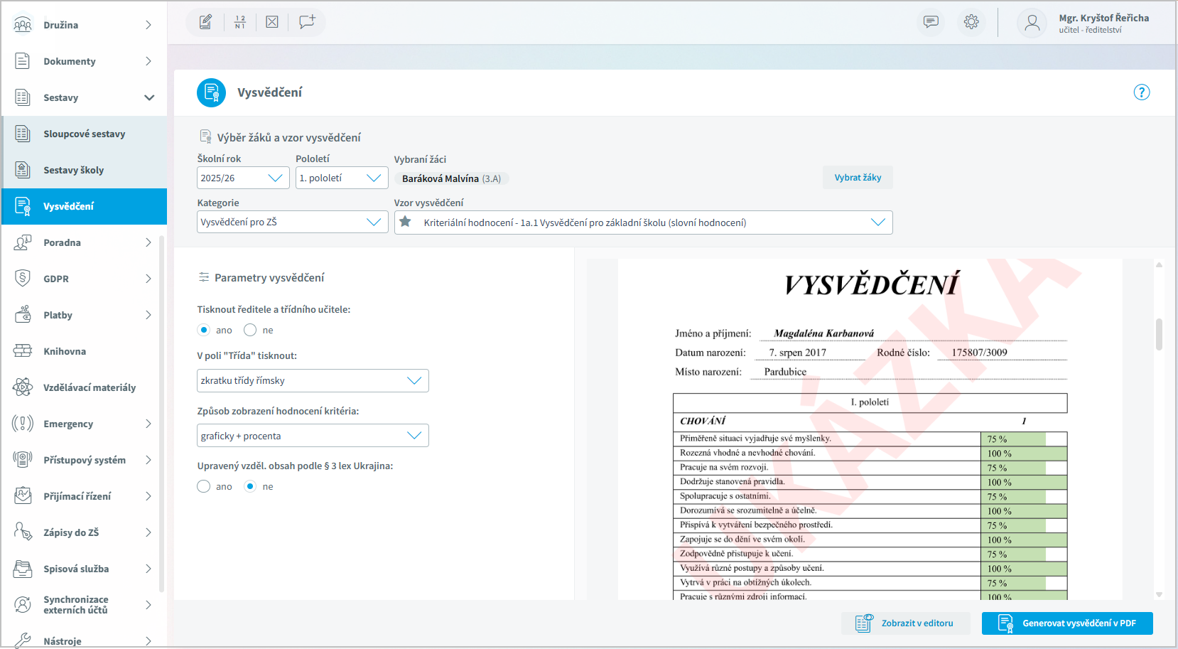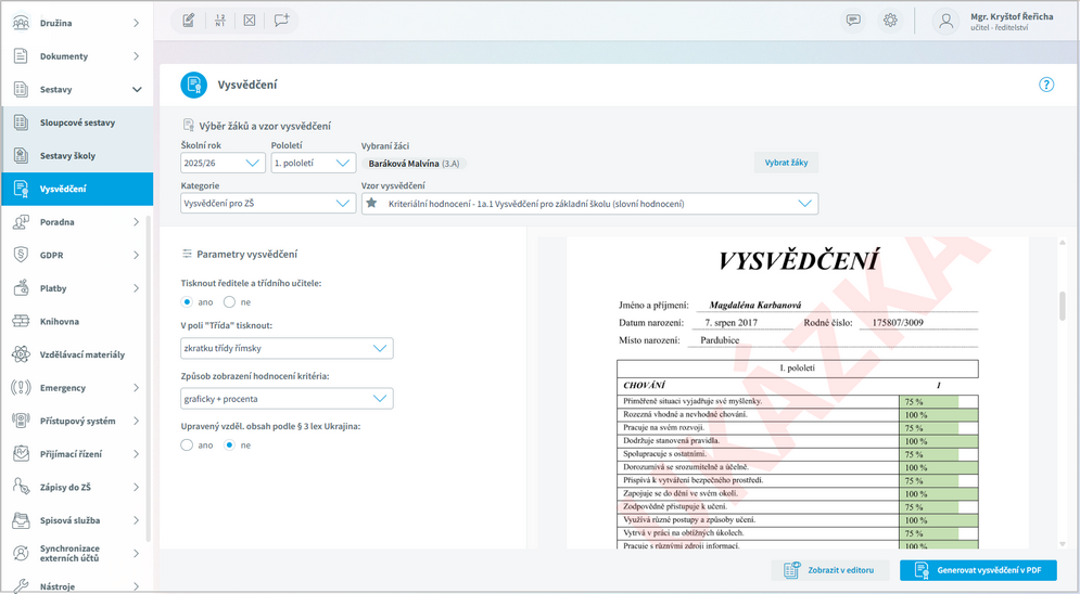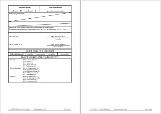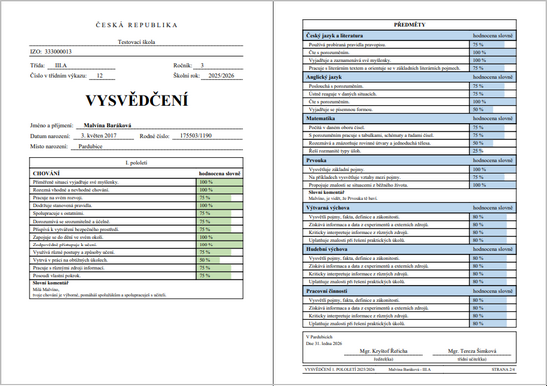 Ve vygenerovaném PDF můžeme vysvědčení vytisknout.