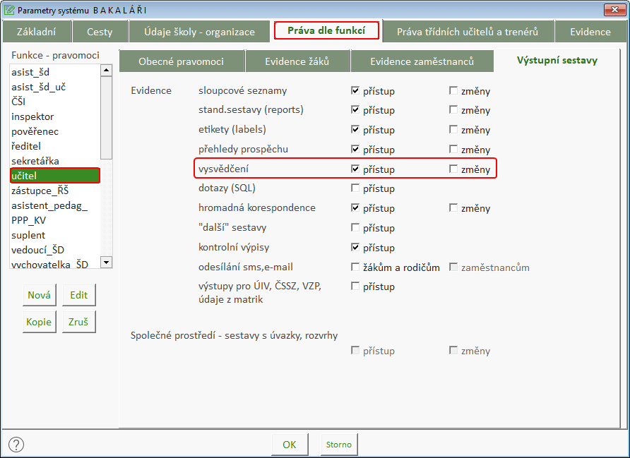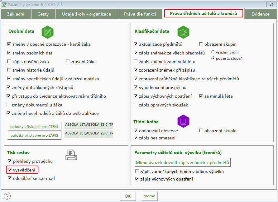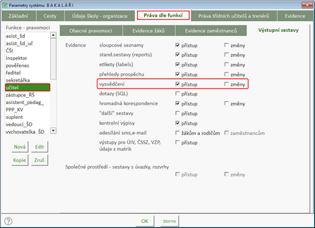 Práva k tisku a editaci vysvědčení se řídí nastavením v parametrech systému na úrovni jednotlivých rolí, případně dle třídnictví.