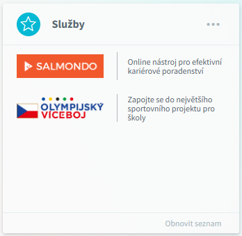 Příklad: 1. Kariérové poradenství Salmondo - pověřený výchovný poradce, zabývající se kariérovým poradenstvím, bude přesměrován přímo do aplikace Salmondo. 2. Olympijský víceboj - pokud je škola zapojena do projektu Olympijský víceboj, rodiče a žáci mohou ve své webové aplikaci vidět udělení dipolomy a odznaky. |