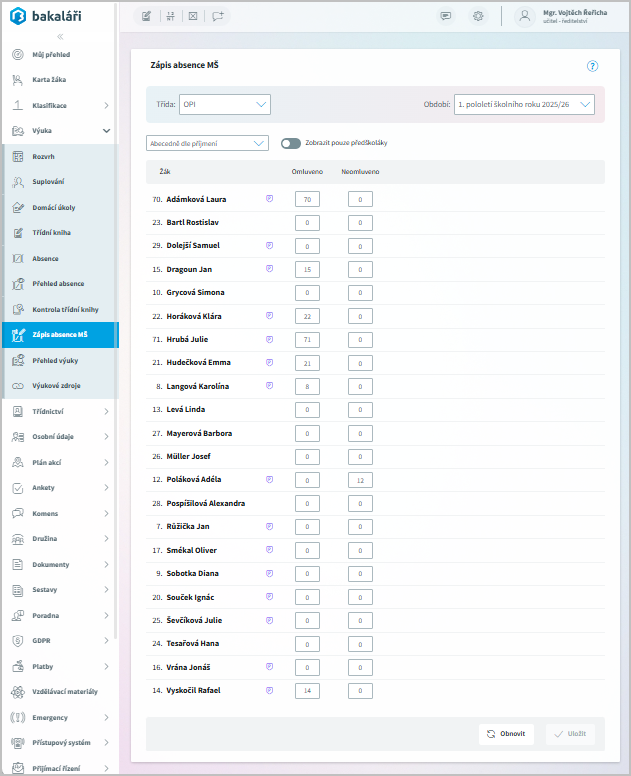 Zápis absence pro žáky mateřských škol najdeme v nabídce Výuka, Zápis absence MŠ.