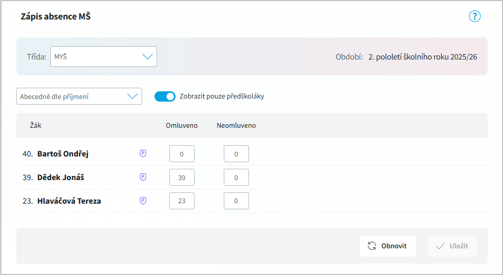 V zobrazení můžeme zvolit, zda uvidíme všechny žáky nebo pouze předškoláky.