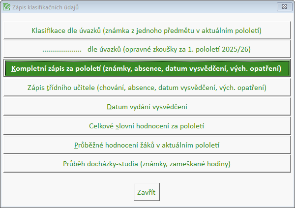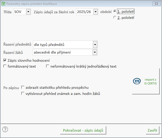 Vybereme třídu a období a pokračujeme tlačítkem Pokračovat - zápis údajů.
